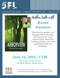 Connecticut author and essayist Karen Guzman will discuss her most recent novel, share her writing process, and take questions from the audience. In-person at Stonington Free Library, 20 High St., Stonington. NOT live streamed. It will be recorded for future viewing.