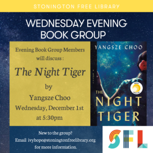 Join us on December 1st @ 5:30 in the middle room of the library to discuss The Night Tiger. “A sweeping historical novel about a dancehall girl and an orphan boy whose fates entangle over an old Chinese superstition about men who turn into tigers.” Email ivyhope@stoningtonfreelibrary.org for more information. Copies will be available at the front desk.