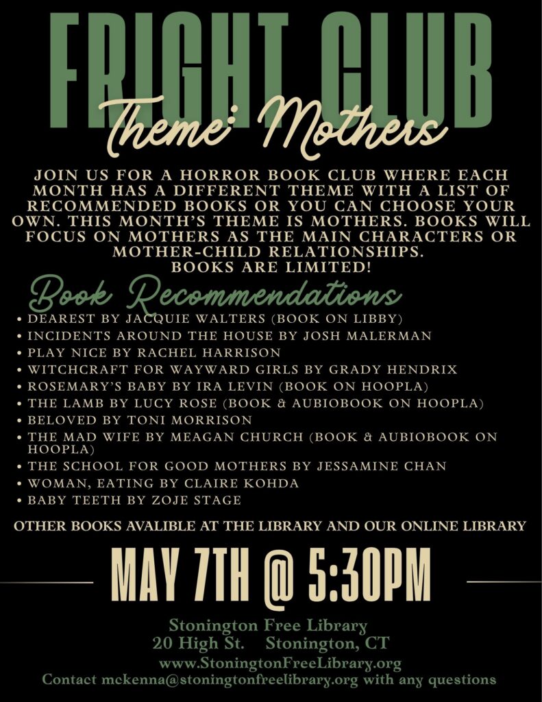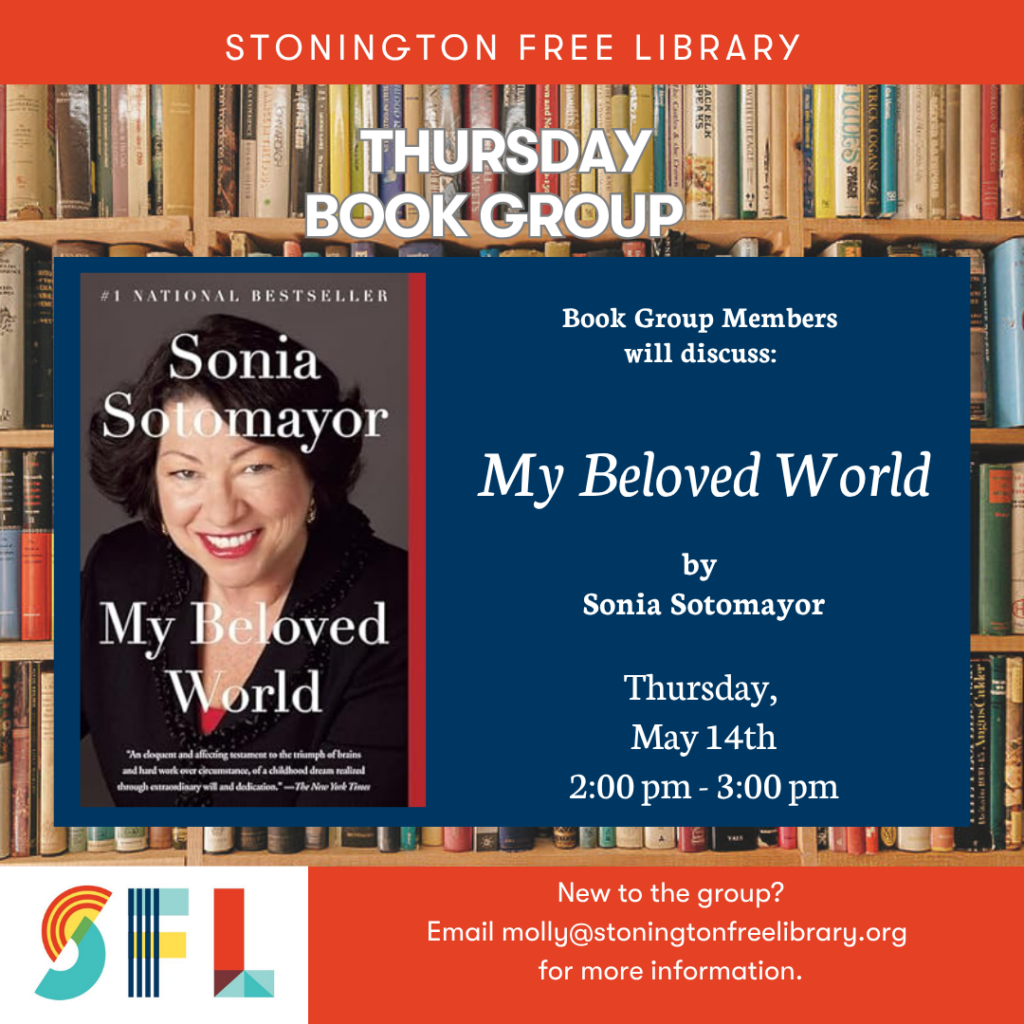 Join the discussion at Stonington Human Services, 166 S. Broad Street, Pawcatuck. For more information email molly@stoningtonfreelibrary.org or call Stonington Human Services at 860-535-5015.