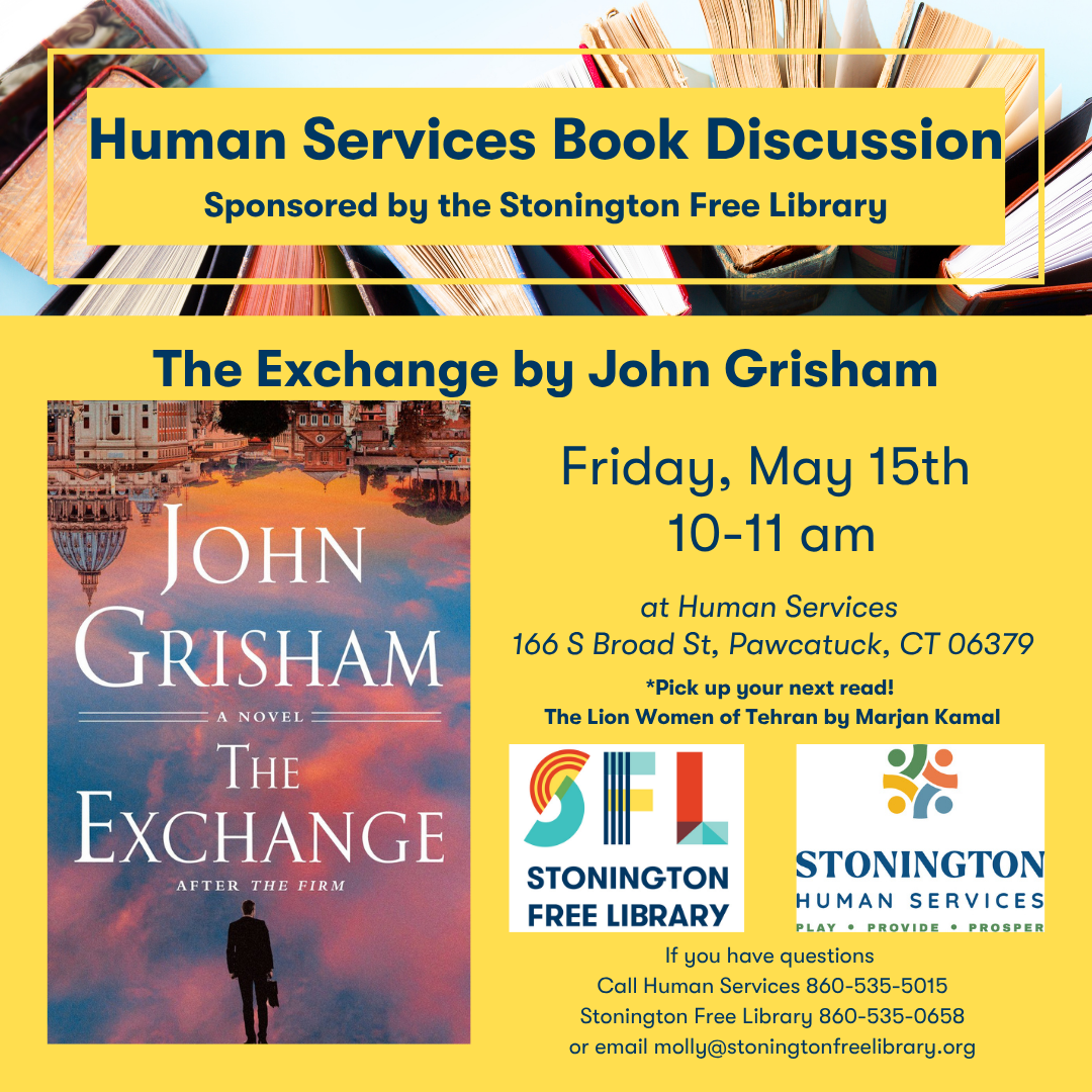 Join the discussion at Stonington Human Services, 166 S. Broad Street, Pawcatuck. For more information email molly@stoningtonfreelibrary.org or call Stonington Human Services at 860-535-5015.