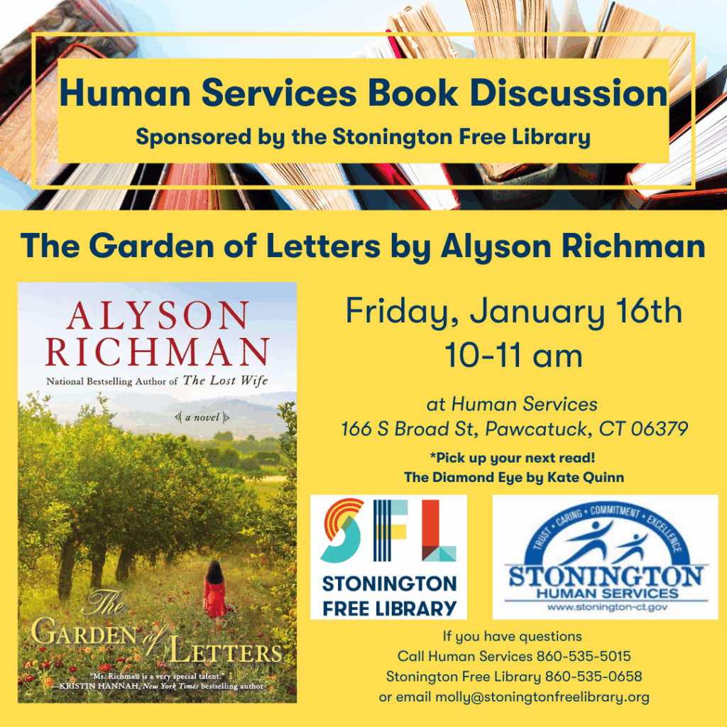 Join the discussion at Stonington Human Services, 166 S. Broad Street, Pawcatuck. For more information email molly@stoningtonfreelibrary.org or call Stonington Human Services at 860-535-5015.