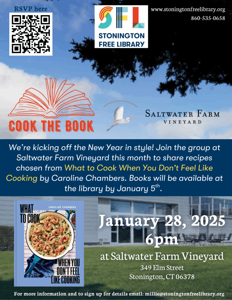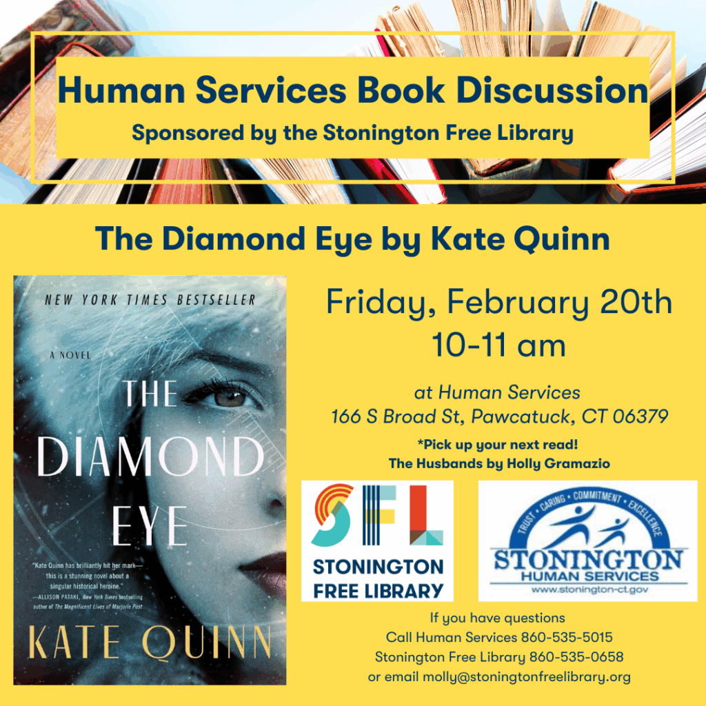 The Human Services Book Group will be meeting at Stonington Human Services to discuss “Lessons in Chemistry” by Bonnie Gamus on Friday, June 21st from 12-1pm. Pick up your next read at the meeting. Contact molly@stoningtonfreelibrary.org for more information.