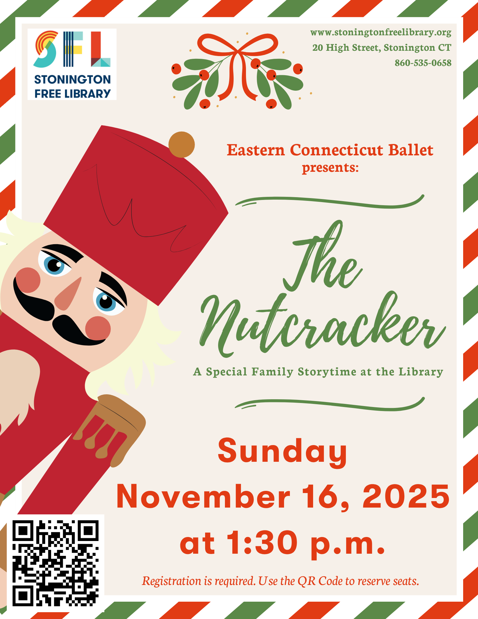 ![]() Join us for a very special family story time featuring the dancers from Eastern Connecticut Ballet's - The Nutcracker. Bring a camera and wear your favorite holiday sweater, dancing shoes or tutu to take a photo with the dancers after the program. Register to reserve your spot. This event is free and open to the |