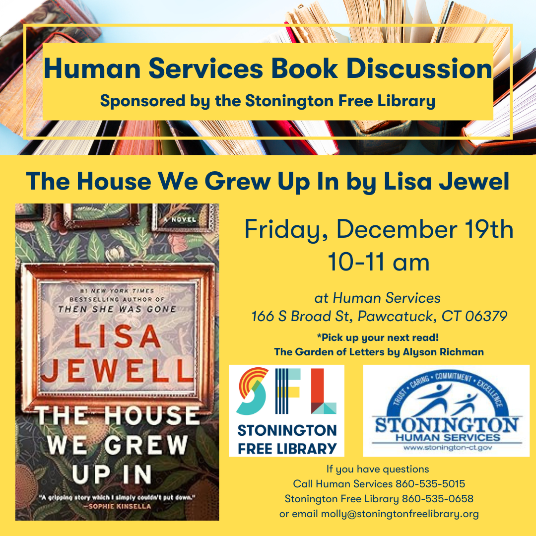 Join the discussion at Stonington Human Services, 166 S. Broad Street, Pawcatuck. For more information email molly@stoningtonfreelibrary.org or call Stonington Human Services at 860-535-5015. |