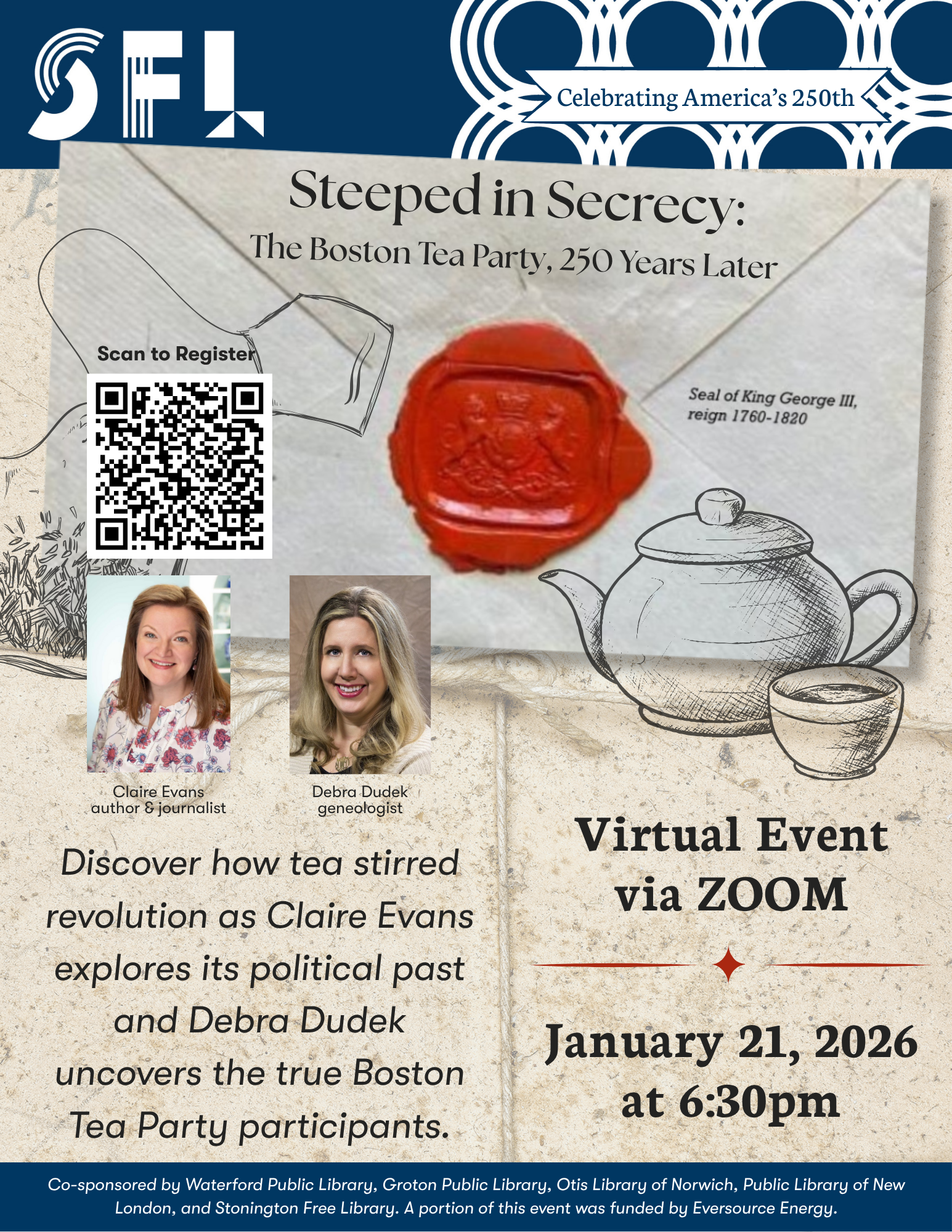 VIRTUAL EVENT via ZOOM January 21, 2026 at 6:30pm Register HERE The story of tea has always been infused with intrigue, particularly when it became a flash point for tensions between England and Colonial America. Learn about the brewing political problems tea presented in its history with Anglophile and former UK resident Claire Evans. Next, |