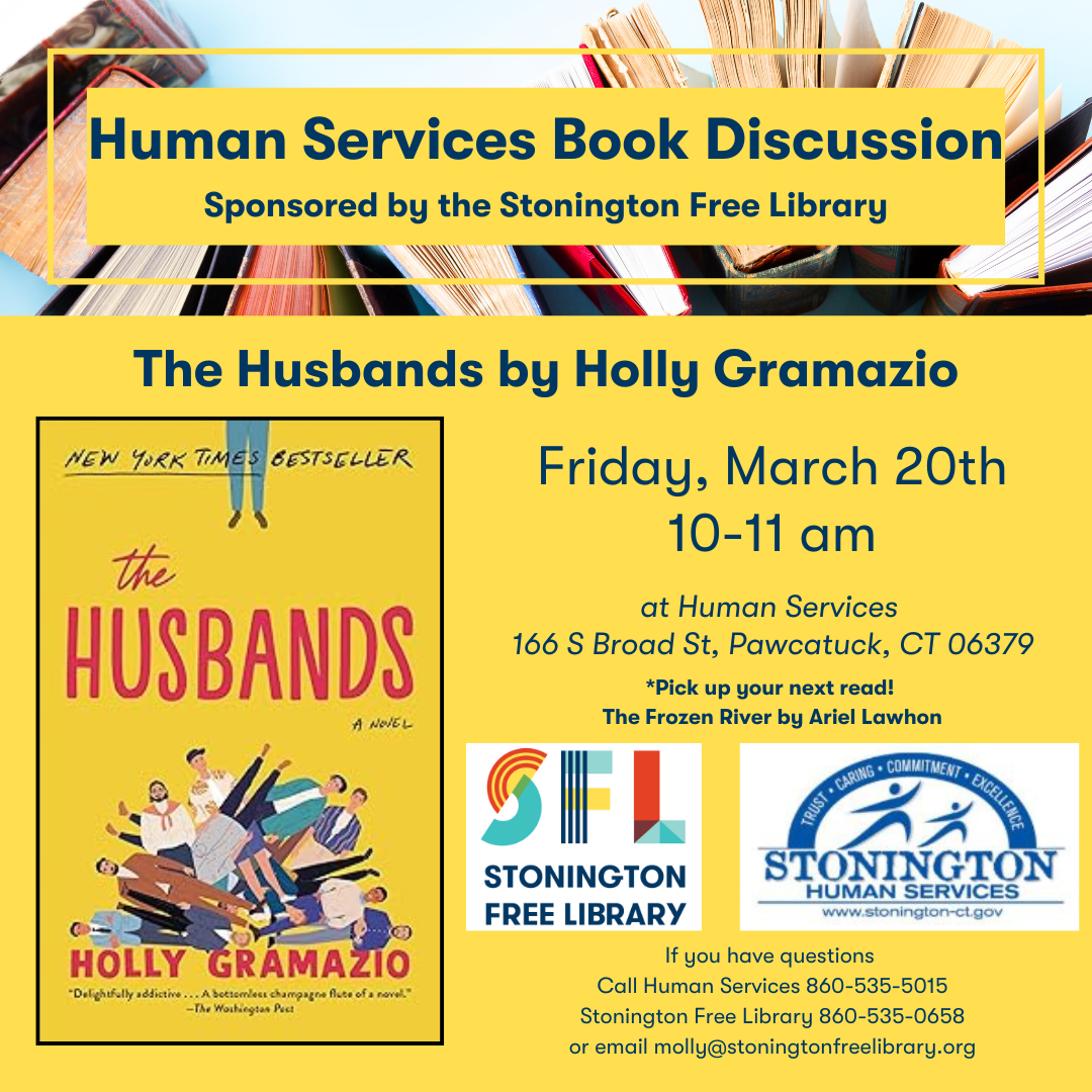 Join the discussion at Stonington Human Services, 166 S. Broad Street, Pawcatuck. For more information email molly@stoningtonfreelibrary.org or call Stonington Human Services at 860-535-5015.
