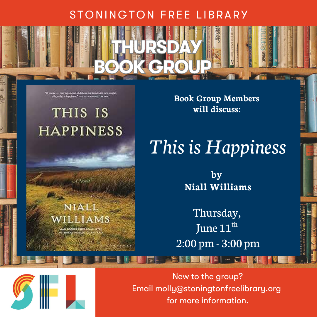 The SFL Thursday Book Group will meet on Thursday, June 11 to discuss This is Happiness by Niall Williams. The meeting will be held at the library starting at 2pm. Join in the conversation and pick up your next read. Check back for updated information. Contact molly@stoningtonfreelibrary.org for more information or to be added to