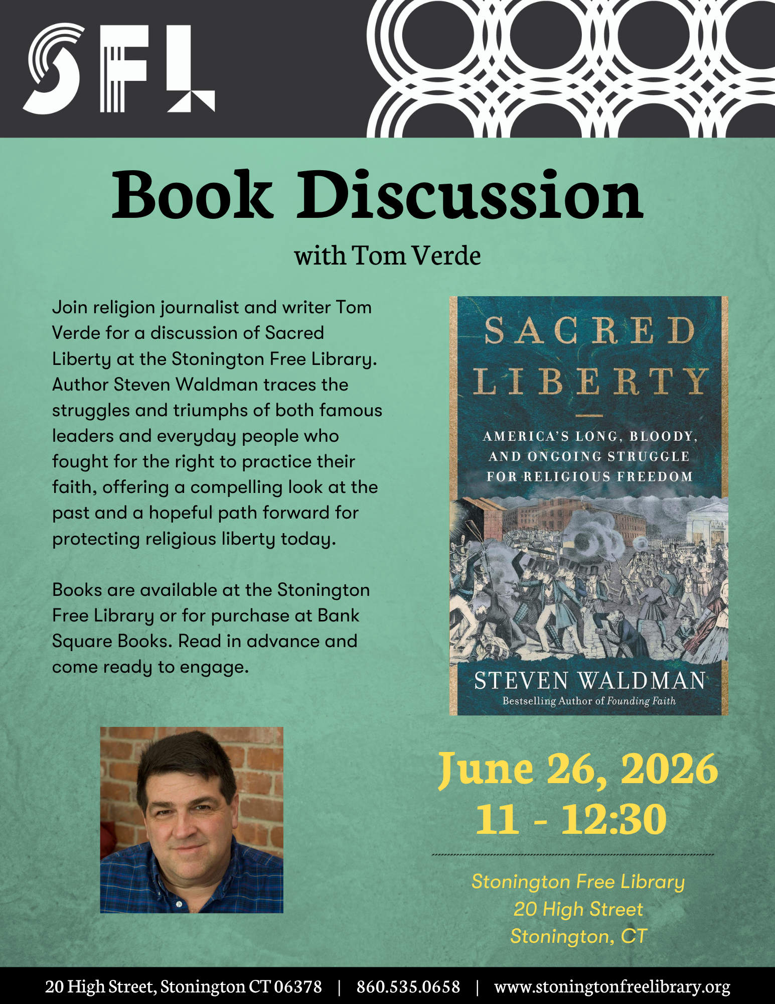 Join religion journalist and writer Tom Verde for a discussion of Sacred Liberty at the Stonington Free Library. Author Steven Waldman traces the struggles and triumphs of both famous leaders and everyday people who fought for the right to practice their faith, offering a compelling look at the past and a hopeful path forward for