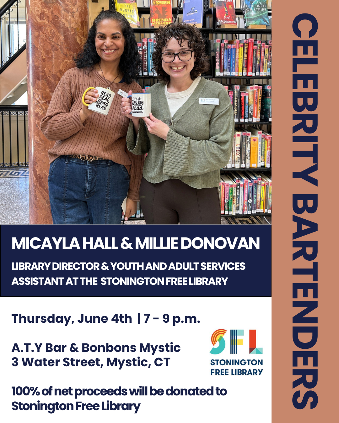 Join Micayla Hall and Millie Donovan on Thursday, June 4, for a FUNdraising event at A.Y.T. Bar & Bonbons in Mystic. Bring friends and watch our SFL librarians mix it up behind the bar. One hundred percent of net proceeds will be donated to the Stonington Free Library.