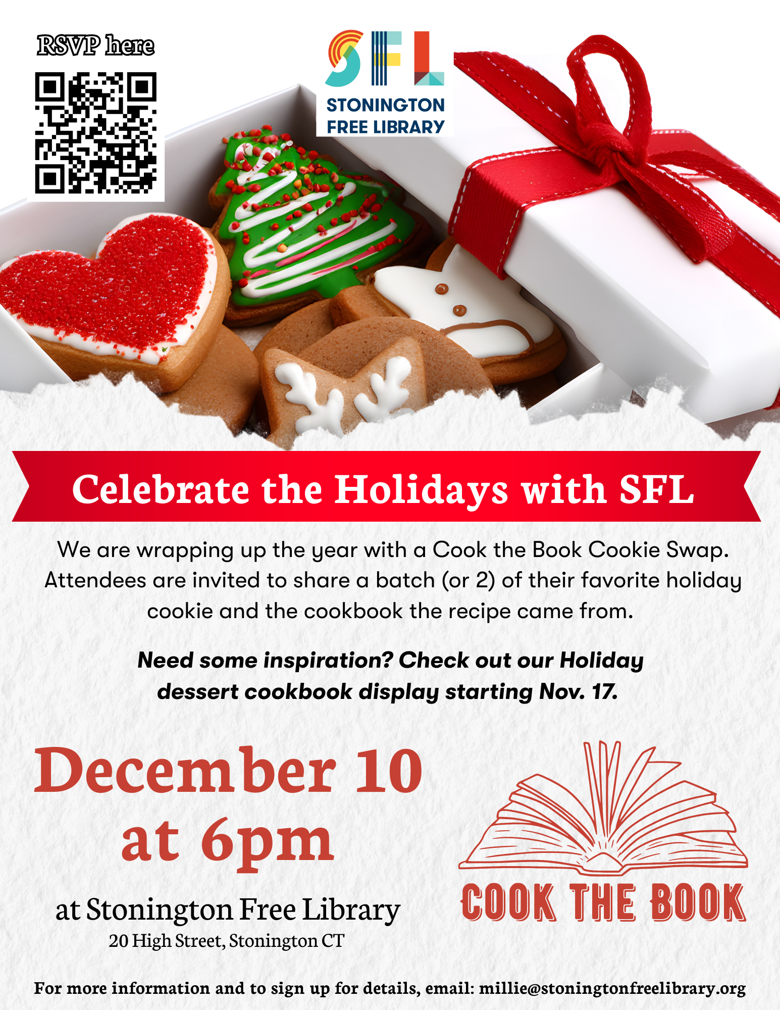 This month the group will be meeting in the library (20 High Street, Stonington) for our Holiday Cookie Swap. Participants are asked to make at least 3-4 dozen of their favorite holiday treats to share/swap. Be sure to bring a copy of the recipe or the cookbook the recipe came from so that we can